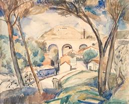 Comme il y a un bleu Klein, il y a un bleu Astruc. On le voit particulièrement dans cette vue paisible de L’Estaque avec au premier plan la tuilerie Fenouil la mer aujourd’hui disparue. Une autre version de ce tableau, titrée La fontaine des tuiles, permettra au peintre d’être primé au salon des artistes Français de 1931.