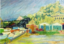 Des grues, des viaducs, un remorqueur, Diana nous donne ici beaucoup à voir dans un tableau coloré dont les aplats distinguent les parties par leurs différentes orientations. Les baraques sont celles des chantier Chagnaud. Léon Chagnaud, ingénieur des Arts et Métiers s’illustre par de nombreuses réalisations dont la ligne 4 du métro parisien. Ce chantier est celui du percement, entre L’Estaque et l’étang de Berre, du Canal du Rove de 1911 à 1926. Ce tunnel s’est en partie effondré en 1963 et n’est plus utilisé.