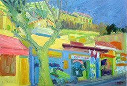 Voici le front de mer de L’Estaque-Plage et ses cafés, représenté par un tableau coloré avec une matière travaillée qui donne du relief à l’œuvre.