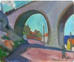 Cette scène animée nous présente le viaduc de la ligne de Paris, tout en haut de la montée Castejon. Un train furtif s’avance, la mer se fait discrète à droite car le tableau est centré sur le groupe de maison sous l’arche. Le lieu n’a pas changé.