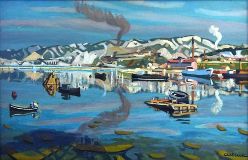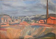 Voici une œuvre très dense qui raconte la mer, les chantiers, les usines, le viaduc sous un ciel dont les nuages font écho aux collines.