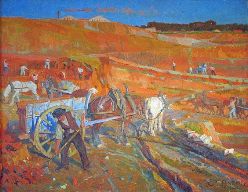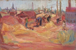 Voici le monde du labeur. Des ouvriers sont courbés, une petite brouette semble bien dérisoire dans ce grand espace, un enfant se tient debout. Est-il là pour travailler ? A droite, figure une tuilerie avec ses nombreuses fenêtres pour le séchage des tuiles. La lumière du tableau contraste avec la tristesse de toute la scène.
