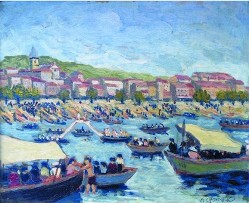 Voici une représentation joyeuse et colorée des joutes dans le port de L’Estaque en 1914. Cette compétition nautique se perpétue aujourd’hui, comme peut en témoigner la Fine Lance Estaquéenne fondée en 1921.
